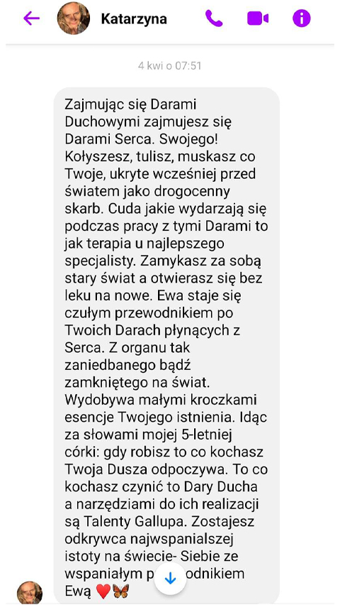 • Jedna sesja z Trenerem Mocnych Stron (1×90-minutowa sesja dedykowana do pracy w obszarze - talenty Gallupa, talenty ducha)