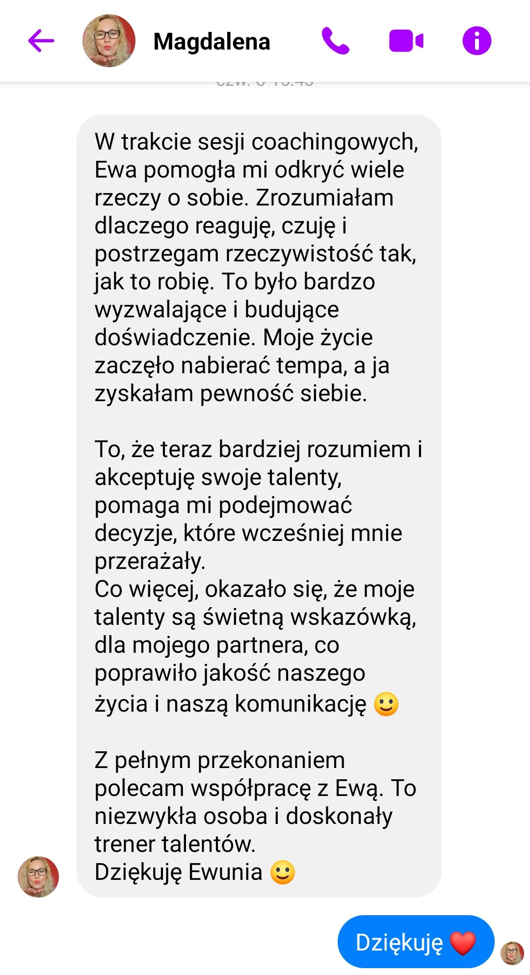 • Zastanawiasz się: - dlaczego podejmujesz pewne decyzje? - dlaczego reagujesz w określony sposób? Odpowiedzi tkwią w Twoich talentach! Jeśli masz wątpliwości, zapraszam na pojedynczą sesję z Trenerem Mocnych Stron.